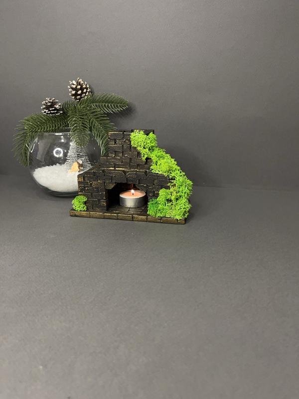 Декоративный подсвечникв формате камина, выполнен из миниатюрных гипсовых кирпичиков и стабилизированного мха. Полностью ручная работа. Возможно изготовить под ваш индивидуальный размер, дизайн, цвет. Размер данной модели: ш8*д15,5*в11 см.