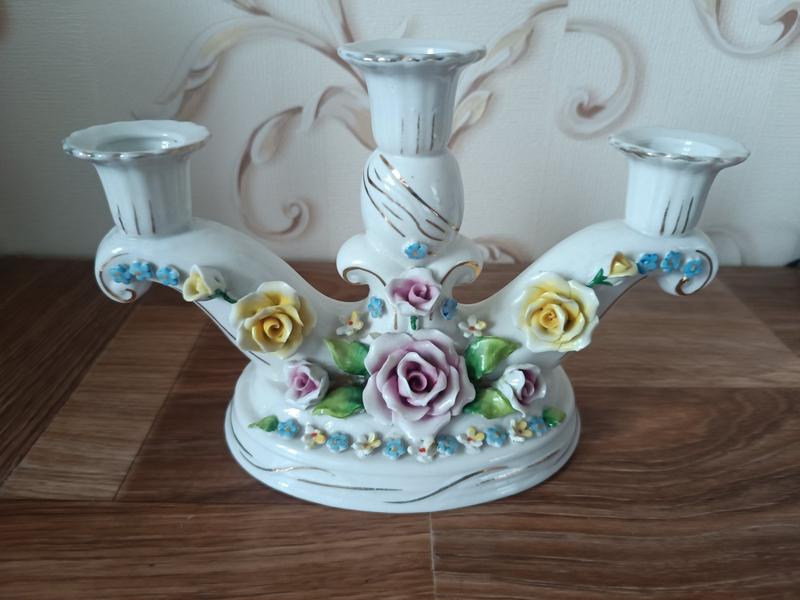 Подсвечник. Германия. Винтаж. Красивый фарфоровый винтажный подсвечник на три свечи. Германия. Клеймо. Made in Germany. Рисунок чёткий, позолота не затёрта. Материал: фарфор. Размеры: 24х15х11 см. Состояние: такое как на фото. Смотрите мои лоты.