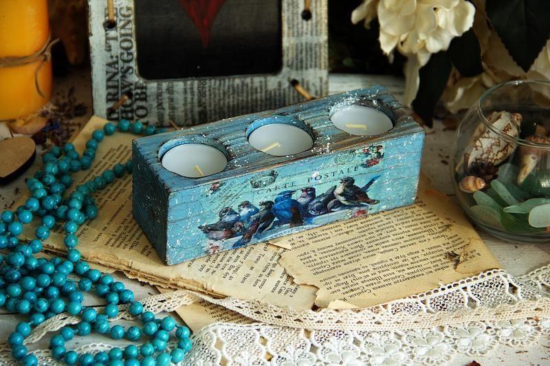 Очень простой способ добавить немного тепла и уюта в интерьер любой комнаты - зажечь свечи) Ужин при свечах даже с макаронами на самой простой кухне покажется раем в маленьком шалаше) Уютный и теплый подсвечник в синевато-голубоватых тонах на три сменных свечи. Дерево-сосна.длинна 165 мм, ширина 55 мм, высота 55 мм