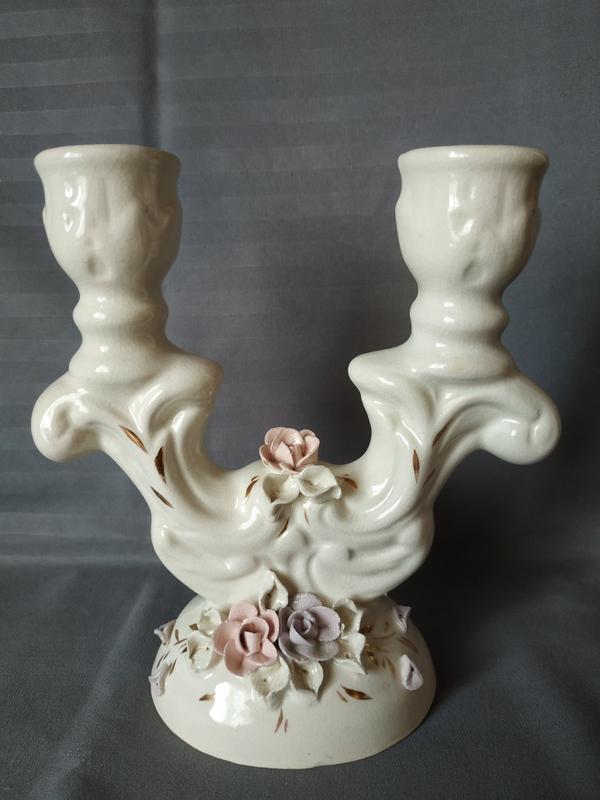 Фарфоровый подсвечник с лепкой. Состояние красивое. Высота 16 см. Діаметр низу 9,5 см. на 8 см .