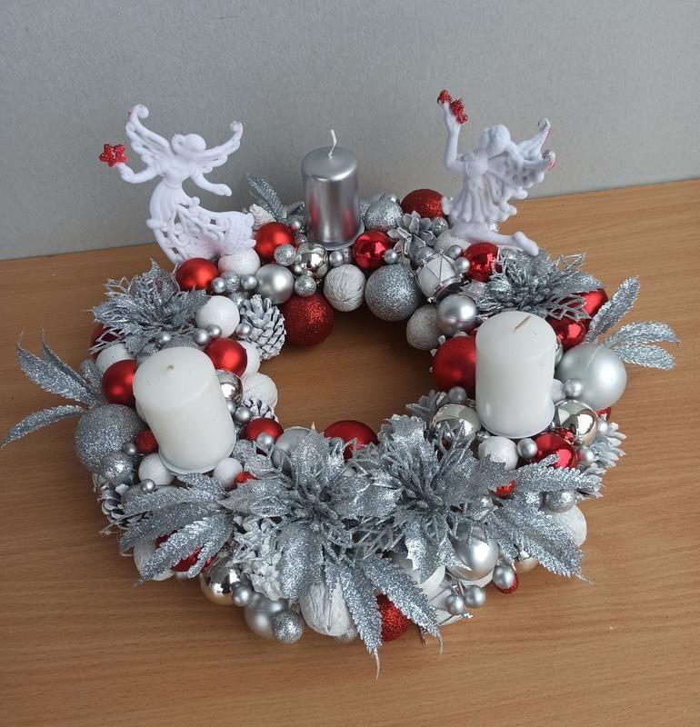 Яркая и новогодняя и рождественская композиции на стол. Серебряная белая и с красным акцентом, поэтому выглядит действительно ярко и празднично. Композиция в виде венки с тремя свечами. Стоимость со свечами 800 грн