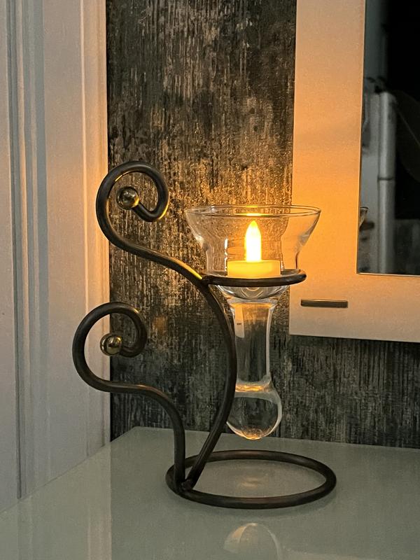 Удивительный подсвечник из массивной металлической основы и стеклянной чаши-капли. Металл создает изгибы и завитки, вокруг стекла, застывшего в момент движения. Когда свеча горит, кажется, что стекло снова расплавлено и вот-вот потечет. Свеча в виде шара, диаметром 6 см, может быть заменена на чайную, или любую другую. Добавляю еще электрическую чайную свечу с батарейкой CR2032. Декор для дому, террасы, веранды. Размеры: 17х11х21 см.