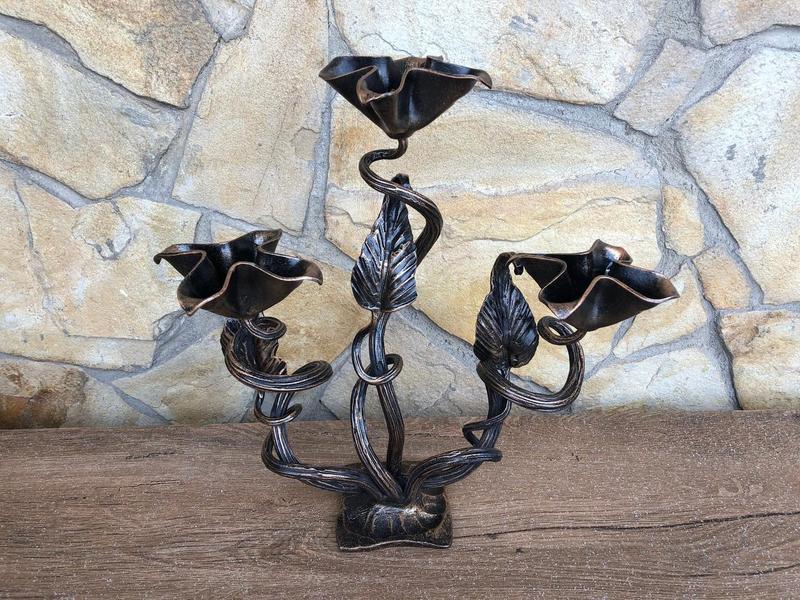 Ищете уникальный подсвечник? Вы нашли то, что нужно! Этот кованый подсвечник на три свечи ручной работы станет не только осветительным элементом, но и настоящим шедевром, который украсит ваш дом и подчеркнет особенности вашего интерьера. Высота: 36 см Длина: 34 см Вес: 2,3 кг Цвет: бронза Этот подсвечник является отличным подарком на свадьбу, день рождения, День матери и другие праздники!