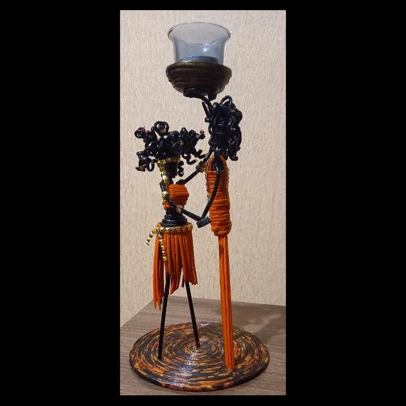 Оригинальный подсвечник из бумажной лозы. Подсвечник изготовлен из безопасных материалов - сплетен из бумажной лозы, окрашен красителями и лаком на водной основе. В основе фигурок прочная проволока, вся конструкция прочная. Внутри ковшика, который держат фигурки, стоит непосредственно подсвечник с небольшой свечей. Если вынуть свечу, то изделие можно использовать например в качестве подставки для ключей или других безделушек. Изделие влагостойкое- можно мыть под проточной водой.Высота 30см, а вместе с подсвечником 34см.,диаметр подставки 16см.