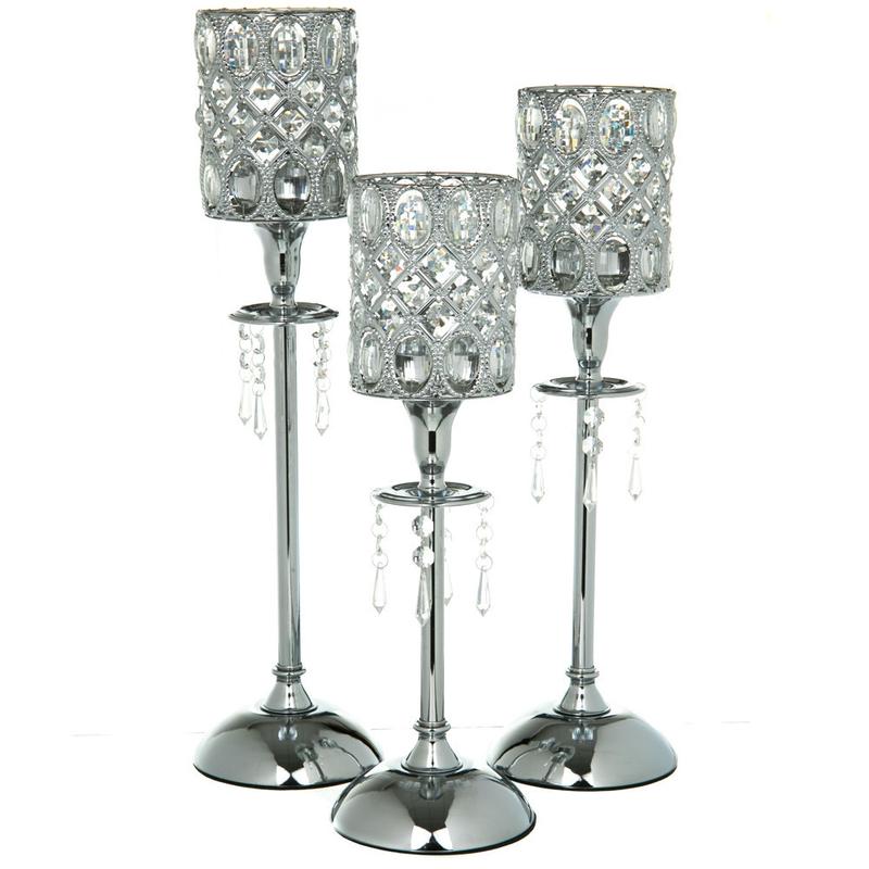 Набор подсвечников из 3-х штук Джулия 53 см 12009-051 уценка- на двух подсвечниках по низу дефект,гнутость металла. Набор подсвечников "Джулия" из серии "Барокко" представляет собой три подсвечника цилиндрической формы из металла серебряного цвета и стекла, который прекрасно дополнит ваш свадебный стол. Он прекрасно впишется в интерьер вашего дома ,в декор на вашем мероприятии. Его уместно преподнести в качестве презента на любое торжество. Этот набор представляет собой изысканное произведение искусства и свидетельствует о тонком вкусе своего хозяина. Большой 53 см., средний 48 см., маленький 43 см.