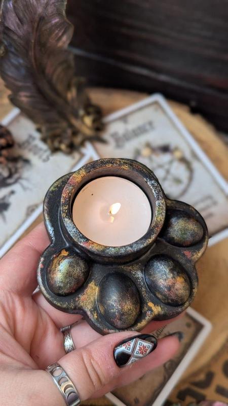 Цей підсвічник — це наче котик сказав "горі тут" і поставив лапу. Кольори космічно-бронзові, як натхнення від Ніла Ґеймана після кількох чашок кави. Ідеально тримає свічку-таблетку, даруючи тобі приємне сяйво і відчуття магічної присутності котячого духа. Виглядає химерно й дорого водночас — як щось із секретного горища доброго мага. Може стояти хоч у спальні, хоч на вівтарі, хоч у ванній — де б ти не викликав світло. А якщо захочеш — можеш назвати його Муркотик Світла, ніхто не забороняє.