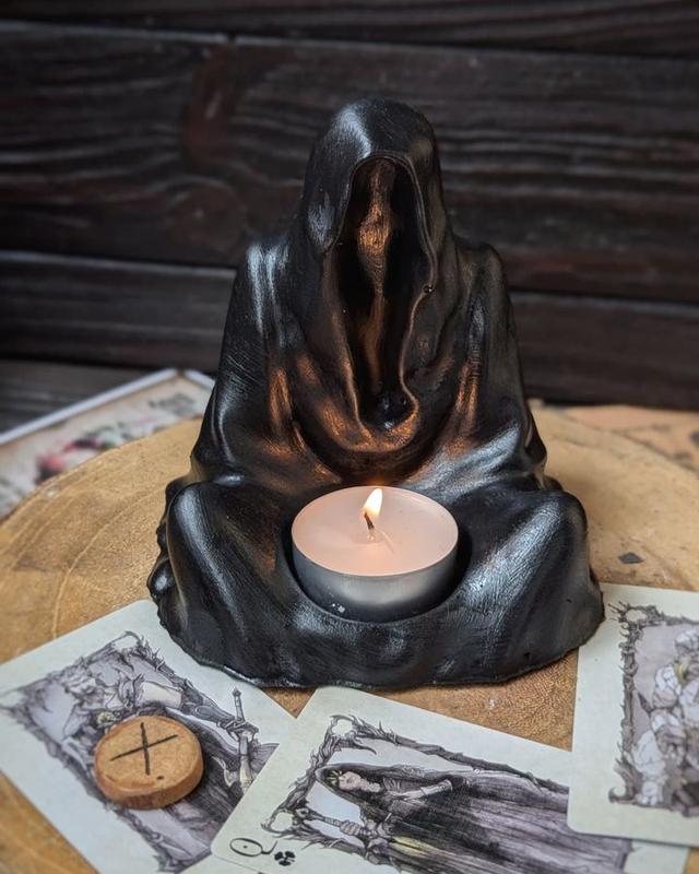 Загадкова постать у глибокому каптурі, застигла у вічній медитації. Виглядає так, ніби ось-ось прошепоче забутий заклинальний шепіт, поки ти намагаєшся просто запалити чайну свічку. Ідеальний аксесуар для тих, хто хоче світла – але з натяком на потойбіччя. Його чорна матова поверхня поглинає увагу не гірше за чорну діру. Відмінно підходить для ритуалів, медитацій або просто як символічний “не чіпай мене до кави”. У комплекті з ним ніби йдуть 2 рівня духовного просвітлення і тіньова присутність. Якщо тобі подобаються речі, які ніби дивляться у твою душу — ось, тримай.