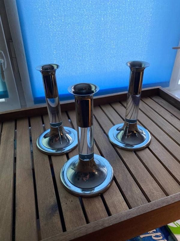 Підсвічник виготовлений із неіржавкої сталі та полікарбонату від італійського виробника Balzano. Приблизно 70-ті рр. Сліди використання відсутні. Розміри: висота — 17 см, Ø (верх) — 4 см, Ø дно — 10 см