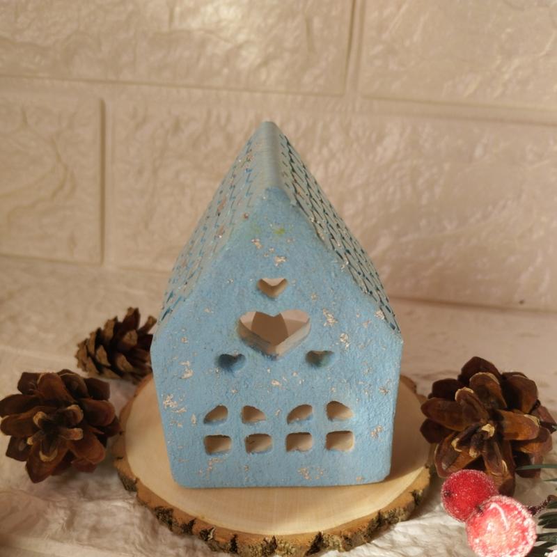 ✨ Уютный подсвечник в виде домика в голубом цвете✨ материал :гипс Свет свечи мягко сияет сквозь окошки и сердечки, даря атмосферу тепла и праздника 🎄🏡 🔥 Безпечна LED-свічка в комплекті дополнительный декор: деревянная основа+20 грн