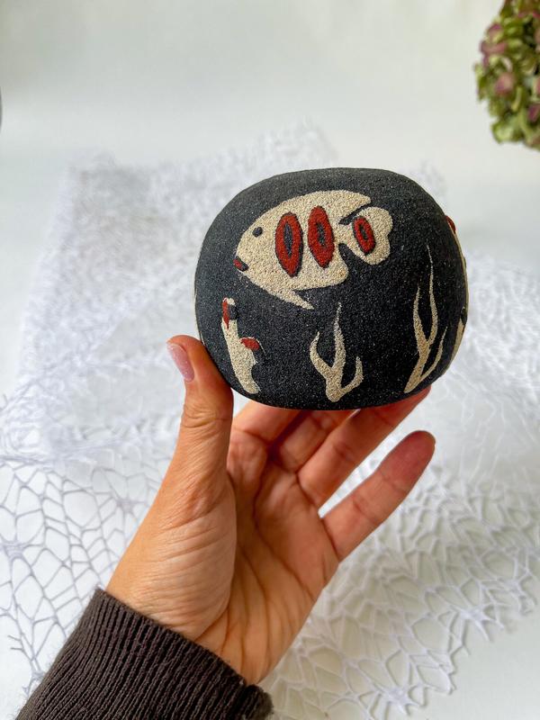 Цікава річ на морську тематику. Виконана у формі кулі, поверхня і малюнок виконані з вулканічного чорного піску. Висота і діаметр заглиблення для свічки є на фотографіях. Стан дуже хороший. Основа керамічна, пісчаний декор сидить міцно. Є мікро облуплення піску на заглибленні для свічки але вони майже непомітні. З оформленням замовленнь через сайт Шафи працюю тільки по повній оплаті на карту, з безпечною згодою більше не працюю. Відправлення Нова Пошта і Укрпошта Накладений платіж обговорюється особисто (передплата 200 грн). Страхую посилки на всю сумму. Надійне пакування. Бронь 1 доба Роблю відеоогляди. Можливе подарункове пакування (+200-300 грн до ціни)