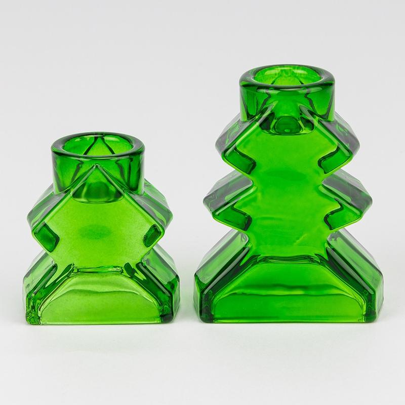 Набор из двух подсвечников Высота подсвечников - 8.5 и 6 см Набор подсвечников в виде елки - праздничный акцент, который придаст уют вашему дому. Изготовленные из зеленого стекла они прекрасно переливаются в свете огня и создают атмосферу тепла и гармонии. Такой декор станет украшением праздничного стола или полочки, дополнит зимний интерьер и подчеркнет новогоднее настроение.