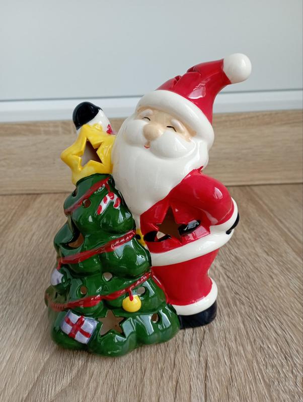 Продам волшебный новогодний подсвечник с изображением улыбающегося Санта Клауса и украшенной елки. Идеально подойдет для создания праздничной атмосферы и уюта в вашем доме! ✨ Основные характеристики: Материал: высококачественная глянцевая керамика. Дизайн: яркий, детализированный, в классических красно-зеленых тонах. Особенности: Имеет специальные вырезы в виде звездочек на елке и животе Санты, которые красиво светятся, если поставить внутрь свечу-таблетку или маленькую LED-лампочку (безопасный вариант, особенно если есть дети). Высота