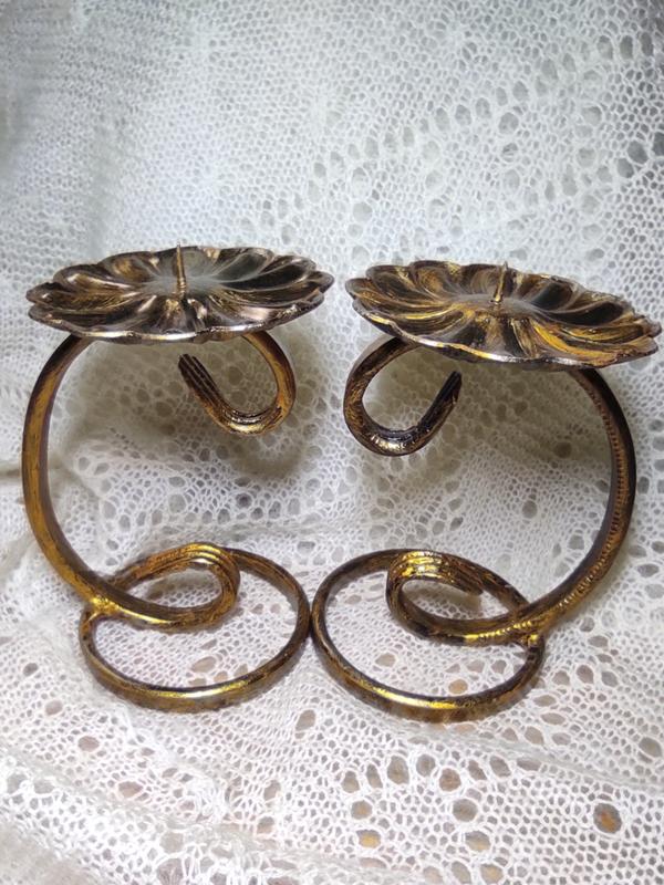 Металлический подсвечник с изящным завитком и цветочной чашей. Винтажный дизайн, теплый бронзово-золотистый оттенок, устойчивая форма. Выглядит легко и элегантно, красиво дополняет интерьер и подчеркивает свечу. Размеры: высота подсвечника 15 см ширина чаши 9 см