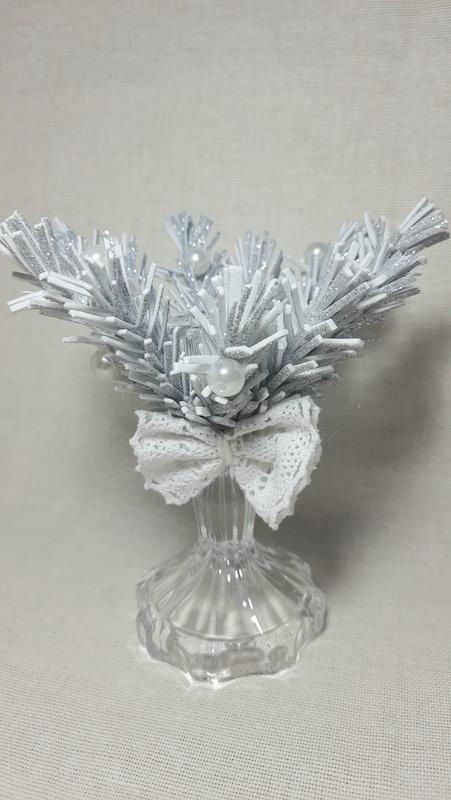 Дуже красивий і блискучий підсвічник декоративний срібний. Можна на "Святу Вечерю". Прикрасить ваш будинок та додасть зимового настрою на вашому святі. Декор із глітерного фоамірану, бусинок і банта з мережива. Підставка під тонку свічку - із скла. Ручна робота, в одному виді.