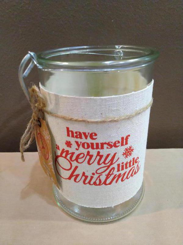Рождественская лампада/подсвечник под свечу-колону c холщевой отделкой и новогодним принтом. Высота 14 см.