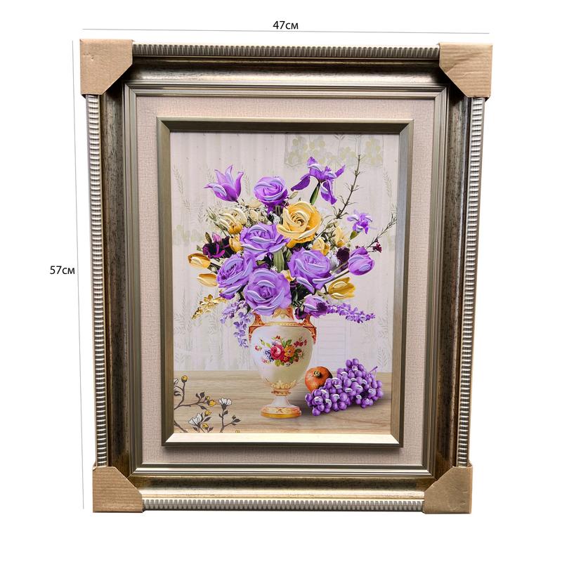 Натюрморт - це живописна композиція, яка зачаровує своєю внутрішньою гармонією та обдарована об'ємністю об'єктів, відображених на полотні. Серед цих об'єктів, нехай це буде ваза, фрукти чи предмети побуту, особливе місце у натюрморті займає квітковий елемент, що робить його особливо витонченим та емоційно насиченим. На цьому полотні можна відчути запах свіжо відкритих квітів, відблиски світла на їхніх пелюстках, які додають нотки життєвості та м'якості до образу. Ваза, що тримає квіти, може бути виконана з різних матеріалів - від прозорого скла, яке додає легкості композиції, до стійкого до часу керамічного матеріалу, що додає образу додаткову текстуру та глибину. Колірна гама натюрморту може варіюватися від теплих, золотистих відтінків світла, що ллється на об'єкти, до насичених та глибоких кольорів квітів, які створюють контраст з навколишнім простором. Кожна деталь натюрморту видається досконало виваженою, а кожен тіньовий перехід чи відблиск світла розкриває структуру і форму предметів. Цей натюрморт - це відображення краси простого, повсякденного життя, яке перетворюється митцем в витончений та вражаючий твір мистецтва.