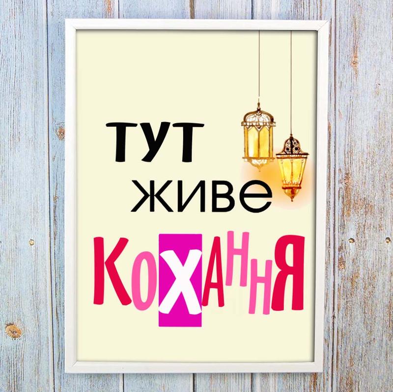 Постер мотиватор 56225 ТУТ ЖИВЕ КОХАННЯ А4 – оригинальный подарок девушке. Картина мотиватор постер в рамке с надписью ТУТ ЖИВЕ КОХАННЯ идеальный подарок на новоселье для пары, на любой праздник для влюбленных. Постер можно повесить на стену либо любую другую поверхность, поставить стол. Мотиватор напечатан на матовой фотобумаге и вставляется в лёгкую рамку со стеклом, задником и креплениями на стену. Оптовый интернет магазин Карнавал Приколов предлагает купить интересные и оригинальные подарки по доступным ценам.