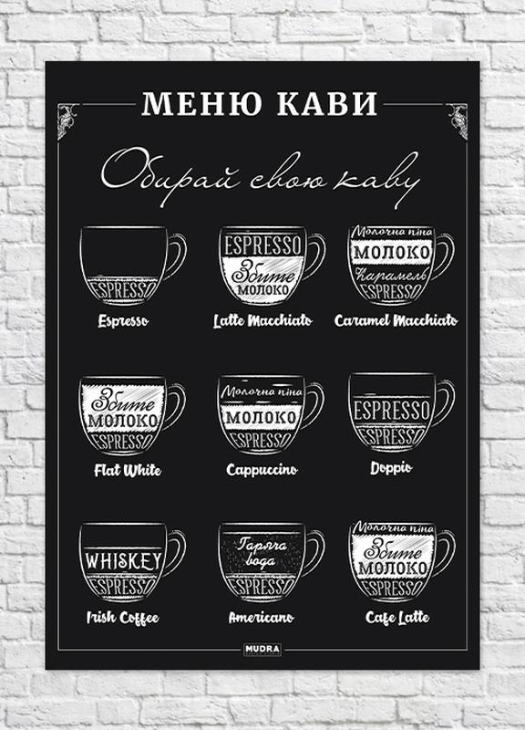Меню кофе со схемой каждого вида. Прекрасно впишется в интерьер и будет полезным для клиентов. Здесь представлены: Espresso, Latte Macchiato, Caramel Macchiato, Flat White, Cappuccino, Doppio, Irish Coffee, Americano, Cafe Latte. На заказ можно убрать любой вид или добить тот, что вам нужен. Также может быть напечатан на самоклеящейся плёнке Oracal. Размер 60х84 см.
