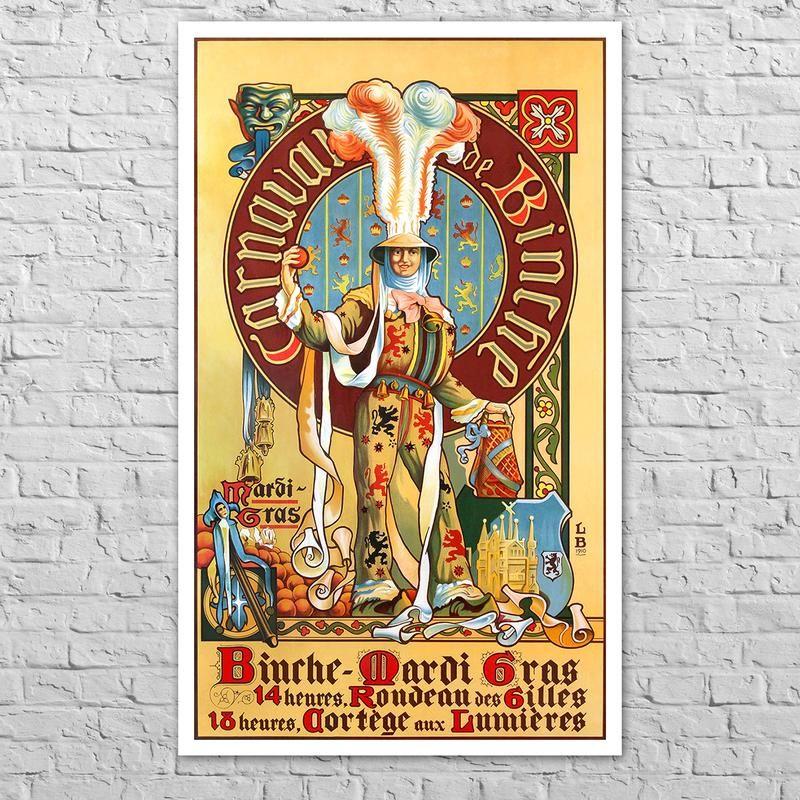 Афиша 1910 с рекламой бельгийского карнавала в городе Бенш. Этот карнавал менее известен чем Венецианский, но всё равно очень популярен в Европе. Автор плаката бельгийский художник и гравер Louis Buisseret (1888 - 1956). Надписи на плакате переводятся так: Бенш - Жирный вторник 14 час, хоровод Жилей 18 час, шествие с огнём Жирный вторник это третий, главный и последний день карнавала в городе Бенш. В этот день происходит легендарное шествие Жилей. Жиль (фр. Gille) - главный традиционный персонаж карнавала. Его историческое происхождение точно неизвестно. Интересным моментом этого шествия считается апельсиновый обстрел. У каждого Жиля имеется плетёная корзина с апельсинами особого сорта, которыми они бросаются в зрителей. Считается что это приносит удачу. Вообще сам праздник, а особенно Жирный вторник, это аналог нашей Масленицы. Празднуются они перед католическим Великим постом. Размер 55х91 см.