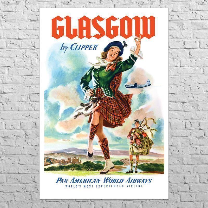 Репродукція постера 1951 року компанії Pan American з рекламою перельотів у Глазго, Шотландія. У 1951 році авіа промисловість вивчала нові літаки. Це були останні дні для пасажирських авіалайнерів із пропелерними двигунами. Pan Am, яка завжди була новатором, почала експлуатувати свої Boeing B-337 Stratocruisers ще в кінці 40-х. Це був двоповерховий літак зі спальними місцями та кімнатою для відпочивання. B-337 літали на більшість найвідоміших маршрутів Pan Am. І от щоб відзначити успішність цієї моделі, компанія випустила серію плакатів, на яких висвітлювалися напрямки та сам літак. Размер 58х86 см.