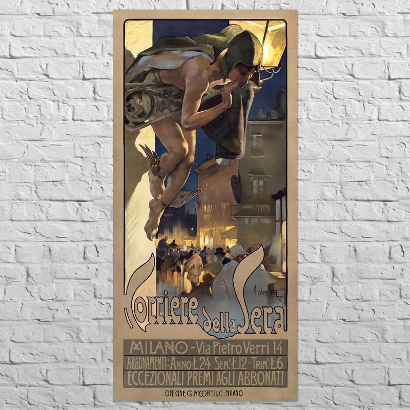 Первый иллюстрированный плакат миланской ежедневной газеты «Вечерний курьер», издающейся в Италии с 1876 года. Газета выходит по настоящее время и является одной из самых влиятельных в стране. Это, пожалуй, самый яркий плакат художника, в своё время возглавлявшего графическое бюро Ricord. Автор очень мастерски использовал свет в вечернем контексте для достижения необычайной красоты. Художник – Adolf Hohenstein. Его считают отцом итальянского плакатного искусства и представителем Свободного Стиля среди художников Ар Нуво Италии. Размер 47х100 см. Дополнительные характеристики: Жанр: Городской пейзаж Жанр: Исторический Ориентация: Вертикальная Поверхность: Матовая Оформление: Без рамы Тип картины: Репродукция