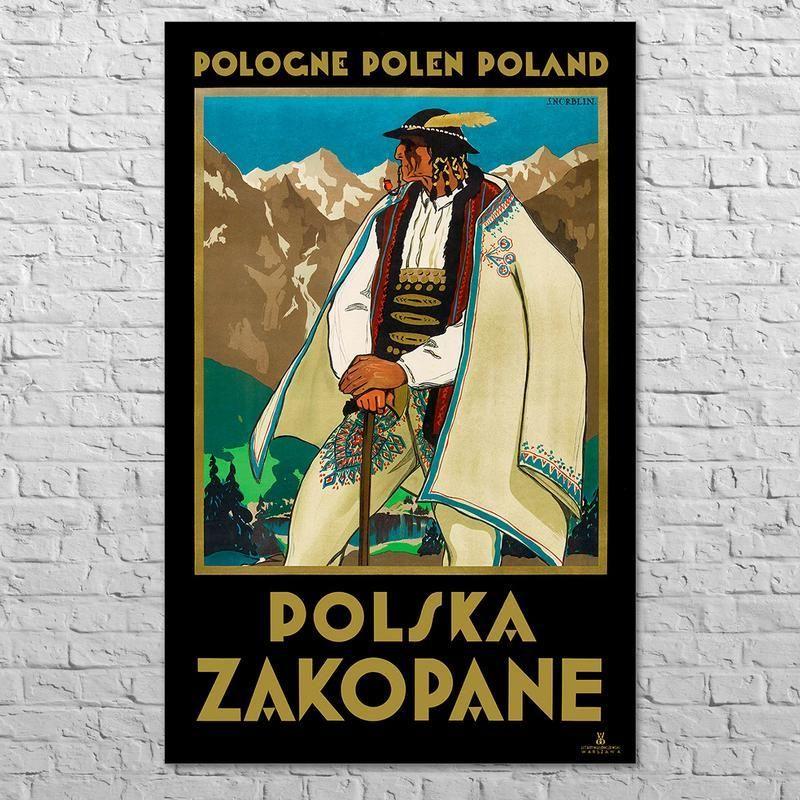 Туристический постер 1925 года с рекламой города Закопане, Польша. Это больше польский город у подножия Татр, а также визначий центр зимних видов спорта. Автор иллюстрации Стефан Норблин (1892 - 1952) — польский художник, иллюстратор, архитектор и модельер. Среди прочего также рисовал модернистские рекламные постеры и картины в стиле Арт-деко. Размер 56х88 см.