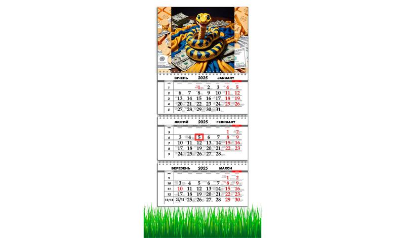 Календарь на 2025 год -отличная идея для подарка . Праздники все государственные, религиозные и профессиональные указаны на двух языках на украинском и английском языках, по новому стилю. Календарь на трех пружинах, настенный календарь с курсором (бегунком) (указатель даты) КАЛЕНДАРЬ НА 2025 ГОД Настенный квартальный календарь на 3-х пружинах Размер изделия: 297х610 мм , изготовленный из белого картона 300 г / м² Размер блоков: 297х140 мм, изготовленные из матовой мелованной бумаги 90 г / м² Календарная сетка на двух языках: украинском, английском (с указанием праздничных дат на двух языках) Комплектуется курсором (указателем даты) и отверстием для крепления с металлическим люверсом