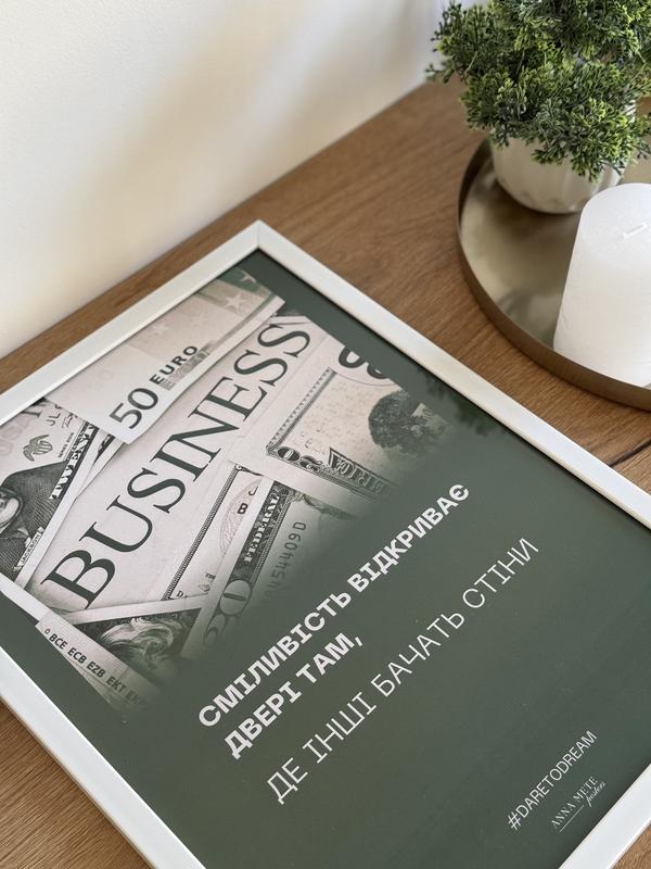 Постер “Смердливость открывает дверь там, где другие видят стены” Смелость и решительность открывают новые пути, дарят возможности и меняют жизнь. Этот постер напоминает: границы существуют только в сознании — стоит шагнуть, и мир откроется навстречу. 🔥 Наполнит пространство энергией уверенности и вдохновения 💪 Будет решительно двигаться к цели 🎁 Идеальный подарок для тех, кто стремится покорять новые - профессиональные и личные - вершины 📐 Размер: 30×40 см 🖼 В рамке: 750 грн (багет 1,6 см, стекло, ДВП, крепление) 🖨 Без рамки: 300 грн Печать высокого качества на плотной художественной бумаге. 📦 Упаковка: крафтовая коробка с логотипом бренда 🇺🇦 Изготовлено в Украине Anna Mete – украинский бренд эстетических постеров для дома. Мы создаем не просто декор — наши постеры добавляют просторную атмосферу, атмосферу и вдохновение. Каждый постер — это маленькое напоминание о чем-то важном: о силе, нежности, вере в себя или любви к жизни. Наши коллекции: • мотивационные • для вдохновения • патриотические • подарочные • интерьерные • репродукции картин украинских художников • для дизайнеров интерьера 👉 Смотрите другие наши объявления — найдите постер, который откликнется именно вам.