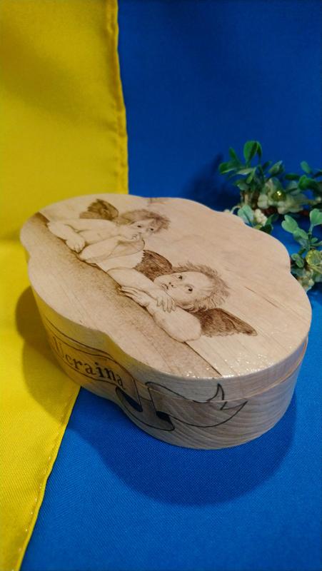 Скринька, виконана вручну, пірографія за мотивами Рафаеля "Сикстинська мадона" і написом на італійській мові "Pace in Ucraina", мир на Україні. Покрита лаком. Розміри 15.5*11*3.5