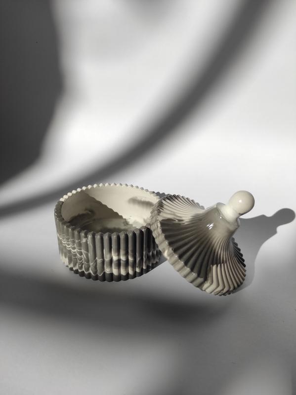 шкатулка из гипса в технике мрамор. подходит для хранения бижутерии и небольших украшений\ предметов. прекрасной подойдёт для украшения интерьера , так же в качестве предмета фотосессии. размеры : высота 9см , ширина 8 см, высота без крышки 3.5 см примерный обьем 175мл цвет : белый с серым глянец цвет изделия может немного отличаться от фото