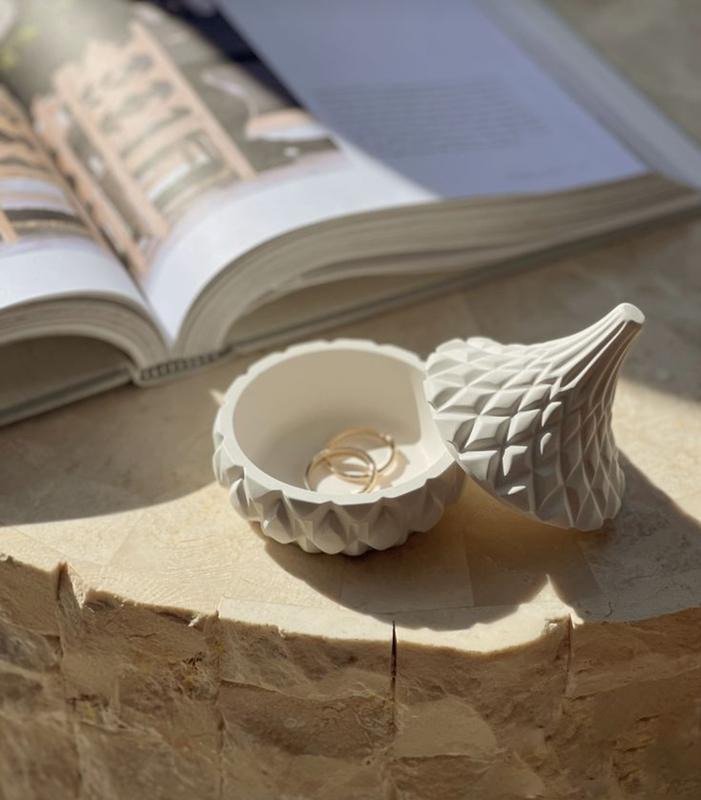 шкатулка из гипса. подходит для хранения бижутерии и небольших украшений\ предметов. прекрасной подойдёт для украшения интерьера , так же в качестве предмета фотосессии. размеры : высота 9см , ширина 7.5 см, высота без крышки 3 см цвет белый цвет изделия может немного отличаться от фото
