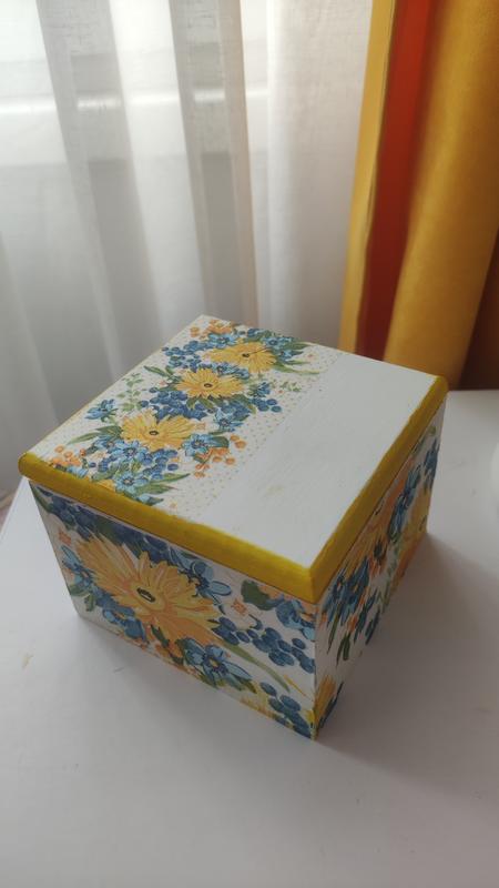 Шкатулка выполнена в технике декупаж, покрыта лаком для украшений или других мелких вещей. 10*10, высота 8 см.