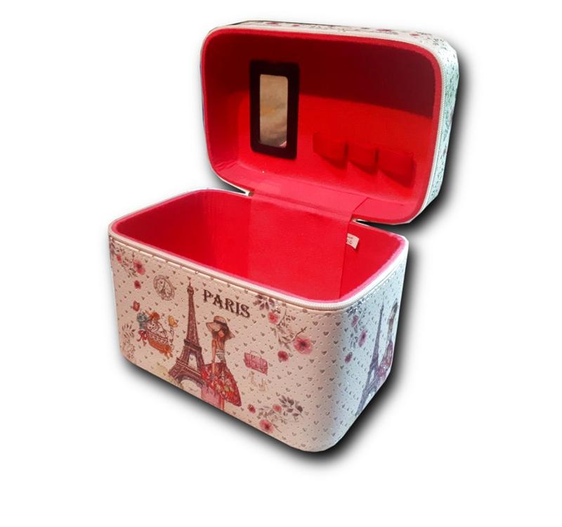 Шкатулка из искусственной кожи с отделениями для ювелирных украшений и бижутерии. Размеры: 19*10*11 см Застежка: змейка Ручка: есть, пластик Белая матовая эко кожа со стильным рисунком инкрустированная камнями в виде сердец. Внутри шкатулка отделана велюром. Также внутри расположено зеркальце. Шкатулка для украшений - не просто стильное дополнение к вашему интерьеру, но еще и функциональная вещь, в которой можно хранить самые разнообразные мелкие вещицы. Достойный, желанный и многообещающий подарок для каждой модницы.