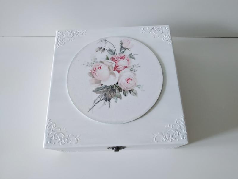 Шкатулка виконана в техніці декупаж розміром 20х20х8 см Додаткові характеристики: Стать: Жіночий Колір: Білий Призначення: Для прикрас
