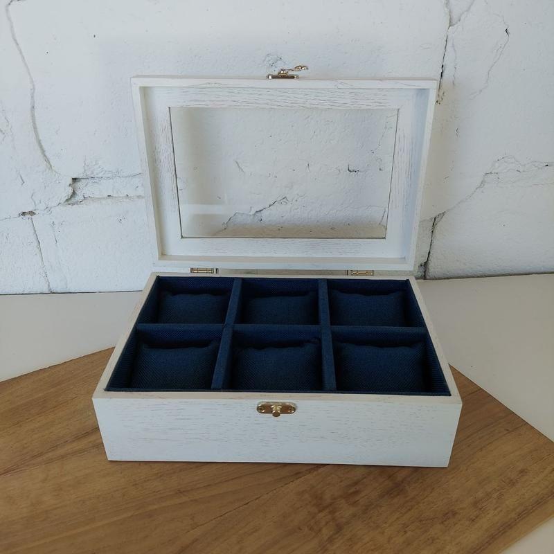 Шкатулка из натурального дерева дуба на 6 ячеек для часов и браслетов. Шкатулка выполнена в классическом стиле на крышке вставка со стеклом. Внутри шкатулки мягкая оббивка, 6 ячеек, в каждой из которой расположена мягкая подушечка для бережного хранения. Шкатулка покрыта мебельной краской классического белого цвета. Идеальный подарок как для мужчины, так и для женщины, который точно не останется без внимания. Вместимость - 6 часов; Материал - натуральное дерево дуб; Закрывается крышкой со стеклом Внутри подушечки из темно синего цвета Покрытие - мебельная краска белого цвета Размер шкатулки - 240*160*100мм Помимо часов, в шкатулке отлично размещаются браслеты, подвески, ремешки. Закрывается шкатулка на аккуратный замочек. При желании, на шкатулку возможно нанесение индивидуальной гравировки в виде буквы, слова логотипа или рисунка.