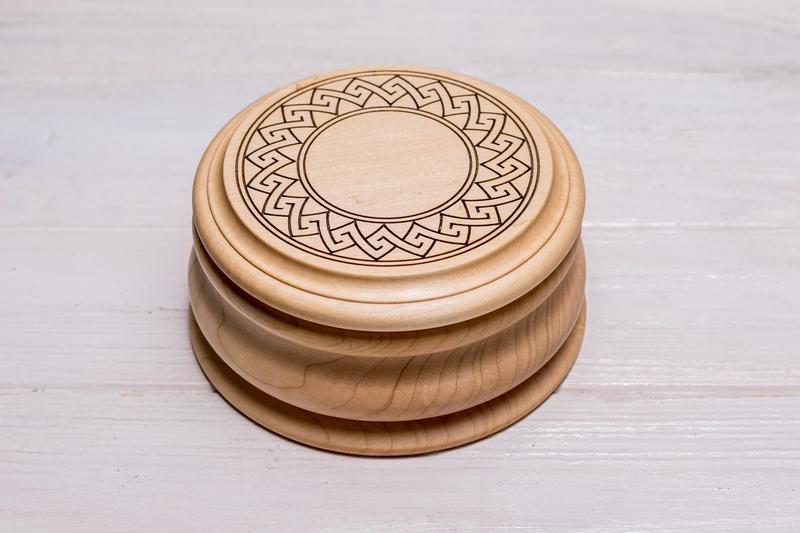 LB-1 .(1-3) Коробочка для украшений из клена/крашенного клена/дуба «Elis» Красивая, стильная и аккуратная круглая шкатулка для украшений с персональной гравировкой - незаменимый аксессуар для истинной ценительницы порядка в личном пространстве. Отлично подойдет как для небольших ювелирных изделий (цепочек, колец, бус, бро́шей, булавок или кулонов), так и для достаточно больших украшений (браслетов, венков или ожерельев). Цельная высококачественная древесина, идеально отшлифованная мастерами столярного дела и пропитанная высококачественным экологически чистым натуральным маслом, премиальный бархат, которым покрыта внутренняя часть основания, делают это изделие незаменимым аксессуаром в каждом женском будуаре. Персонализированная гравировка (это может быть фамильный герб, логотип, просто текст или черно-белая фотография) на дереве сделает это изделие очень душевным и близким тому человеку, кто это получит. Стандартно шкатулка может быть изготовлена из 3-х типов древесины (клен/крашенный клен/дуб). Цвет бархата будет черный (в стандартном исполнении) или бордовый/синий/бутылочный, если Вы это укажете в комментарии к Вашему заказу. Кроме того, мы можем поклеить бархат абсолютно любого цвета по Вашему запросу, но это займет немного больше времени. Материал изделия также может быть другим, если это необходимо. Внешний размер изделия: D120x60 мм, внутренний размер изделия - D95x35 мм. Изделие продается в аккуратной картонной коробке, пригодной для вторичной переработки. По желанию клиента мы можем выгравировать Ваши инициалы, любимую цитату или логотип компании на нашем продукте или даже изменить его конструкцию по Вашему запросу. Кроме этого, мы обернем Ваш заказ в подарочную упаковку или вложим поздравительную открытку с Вашим сообщением, если Вы нас об этом попросите. Обратите внимание: цвет Вашего продукта может незначительно отличаться от изображения, поскольку каждое изделие имеет индивидуальные и уникальные характеристики и особенности древесины. Ежедневно отправляем заказы Укрпочтой (бесплатно от 2000 грн) или Новой Почтой (бесплатно от 4000 грн). Материал: высококачественная обработанная древесина клена/дуба, пропитанная натуральным маслом, премиальный бархат различного цвета. Сделано в Украине по всем стандартам eco-продукции. Дополнительные характеристики: Пол: Женский Пол: Мужской Назначение : Для денег Назначение : Для запонок Назначение : Для колец Назначение : Для косметики Назначение : Для рукоделия Назначение : Для украшений Материал : Дерево Персонализация : Именная Персонализация : С гравировкой