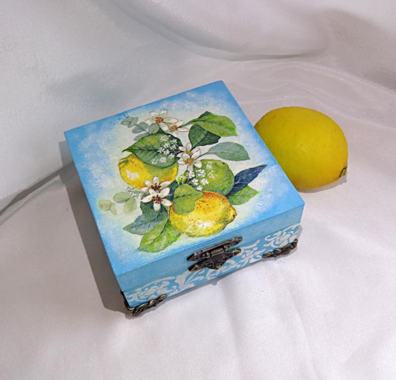 Шкатулка из дерева квадратная в технике декупаж "лимончики"