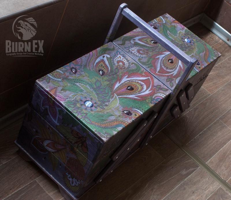 Наконец дошли руки опубликовать один из главных проектов этой весны. Собственно сабж) Большая раскладная шкатулка для рукоделия "Twilight Garden". Это был очень интересный и достаточно сложный проект. Впервые мне пришлось работать с такой составной шкатулкой и с таким большим объемом рисунка. Уверен, что, как минимум, по своему размеру эта шкатулка надолго удержит пальму первенства в моем портфолио. Только посмотрите на эти размеры: Размеры в закрытом виде: только бокс - 690 * 260 * 325мм; высота с ручкой - 325мм; ширина с ручкой - 290мм. Длина в открытом виде 141 см. Глубина поддона - 80 мм. Внутренний размер маленького поддона - 240 х 320 х 80мм. Вес около 10 кг. Работа над этим проектом заняла у меня около месяца. Еще немного информации: Дерево - бук, мебельная фурнитура. Рисунок - пирография (выжигание) и карандаш. Инкрустация - аметисты и лазуриты. Так что насколько все получилось хорошо, судить вам).