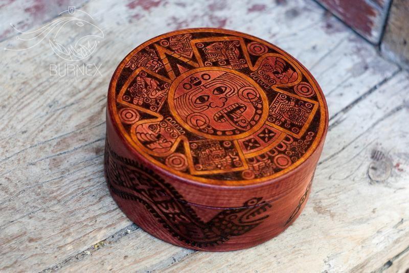 Наконец руки дошли до первой моей круглой шкатулки. Встречайте новый формфактор в моем портфолио. Шкатулка "Aztec Calendar" Дерево. Рисунок - выжигание (пирография). Диаметр шкатулки 12см, высота 5,5 см. Внутри на дне постелен фетр