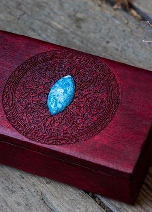 Люблю поєднання темного кольору переднього і якого-небудь яскравого каменю. В даному випадку це темно-червоний і блакитний. А також деталізований вигравіруваний малюнок для прикраси усього цього). Шкатулка "Vintage". Ця скринька підійде для прикрас, а також для стандартної колоди Таро або будь-яких інших карт. Дерево. Малюнок виконаний за допомогою лазерного гравіювання. Забарвлене і лакировано вручну. Інкрустовано лазуритом. Всередині - фетр. Зовнішній розмір 15х9,5х5 див. Внутрішній розмір 13.3x7,6x3 див.