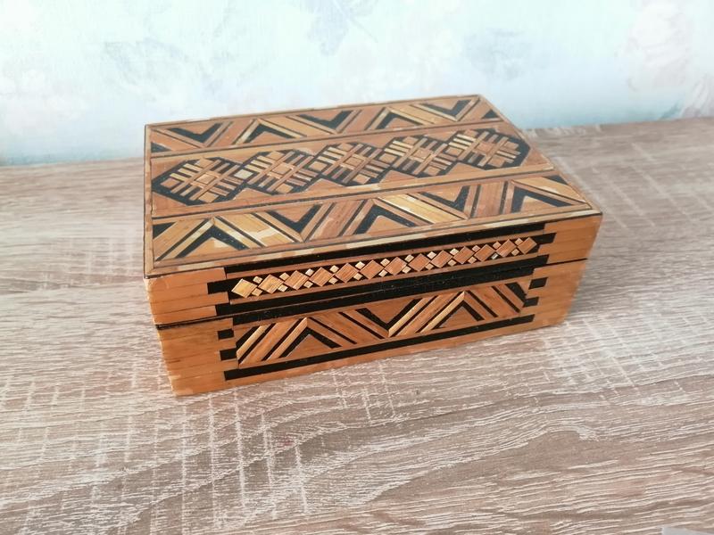 Шкатулка времен ссср, деревянная, инкрустация деревом. Не была в использовании, от времени местами поскалывался лак. Ширина 15, высота 5,5, глубина 10 см.