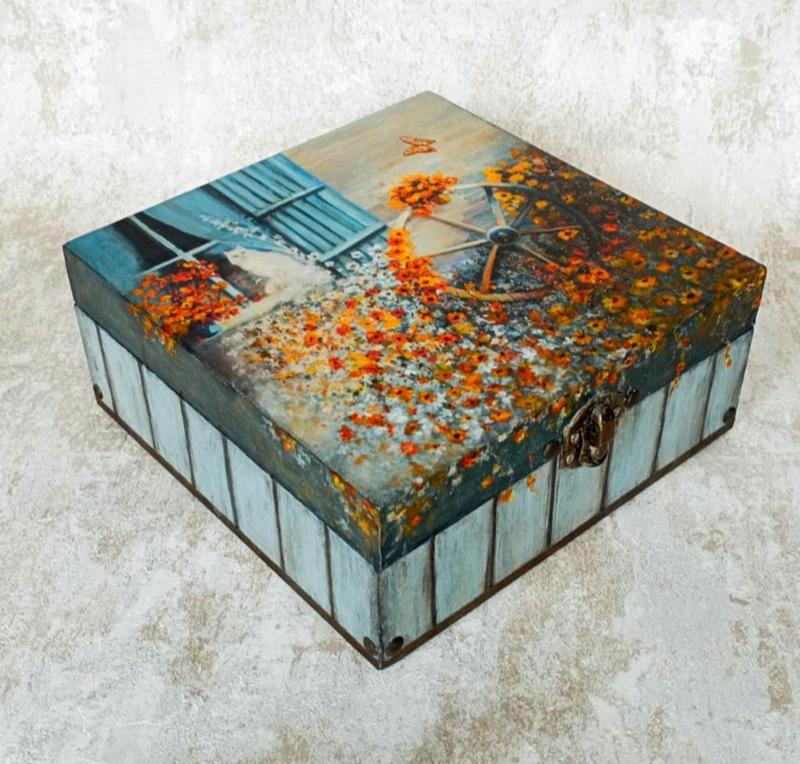 Яркая и эффектная шкатулка для украшений.Выполнена с использованием художественных техник: ручная роспись,имитации старой деревянной поверхности, соответственно со стилем. Достаточно вместительная. и многофункциональная. Можно хранить любимые украшения и различные девичьи безделушки. Отличный незабываемый подарок на праздник любимому человеку или друзьям. Единый экземпляр. Размеры: длина-17см,ширина-17см.,высота-7,2см. Отправка по Украине НП после 100% платы на карт-счет. Возвращение,обмен -нет. Наложенным платежом- не отправляю.