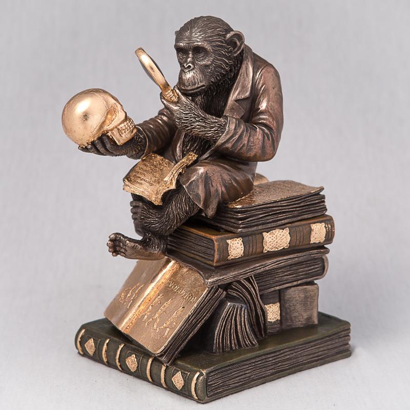 Шкатулка Veronese Обезьяна на книгах 17 см 76129 A5 высота 17 см материал- полистоун покрытый бронзой фирма Veronese Шкатулка "Обезьяна Дарвина" – это миниатюра статуи «Теория эволюции Дарвина», которая находится на острове Обезьян, в южной части острова Хайнань. Эта статуя изображает огромную обезьяну шимпанзе, которая сидит в позе мыслителя Родена на книгах Чарльза Дарвина. В руках она держит череп и циркуль для замеров окружности головы. Статуя выступает символом эволюции жизни в мире. Шкатулка "Обезьяна Дарвина" станет отличным подарком для ценителей искусства, политиков, руководителей, научных деятелей. Статуэтка изготовлена из полистоуна (искусственного камня) и покрыта бронзовым напылением. Упакована в красивую подарочную упаковку. Так что, покупая эту статуэтку вы покупаете ценный и красивый подарок, не требующий дополнения.
