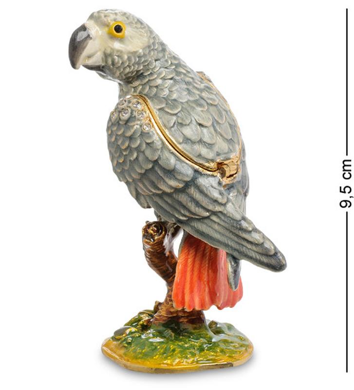 Шкатулка для украшений Попугай 9,5 см 1601611 Причина уценки- нет подарочной коробки Длина: 5.5 см; Ширина: 4 см; Высота: 9.5 см; материал-металл На подставочке, на корявой ветке дерева уселся роскошный попугай. Хвост ярко- красный, на груди серое оперение украшено сверкающими кристаллами, так и кажется, что птица вспомнит о своем пиратском прошлом и хрипло каркнет: «Пиастры!». А ведь попугай на самом беле является хранителем клада. Небольшого, зато настоящего. Этот клад вы можете разместить сами в потайном месте, которое открывается послу открывания верхней части фигурки на петле. Внутри – пусто. Или не пусто, если вы уже решили хранить там свои маленькие драгоценности – колечки, сережки, цепочки. Вот вам и настоящий клад, далеко ходить не надо. Сидит птица на туалетном столике и хранит ваше имущество.