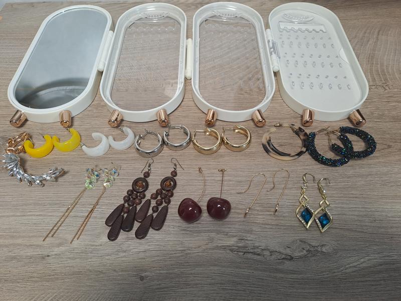 Идеальная шкатулочка для сережек со всеми сережками на фото. В органайзере много отверстий, как для коротких так и для дальних сережек. В шкатулочке сстроено зелено. Компактная шкатулка хорошо складывается и раскладываетс в виде гармошки. Трендовые серьги дополнят образ.