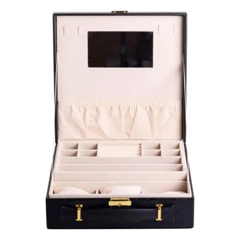 Шкатулка для украшений из эко кожи, 2 яруса - идеальный органайзер для бережного хранения ваших ювелирных изделий. Компактный и функциональный дизайн с размерами 26×26×9 см обеспечивает удобство использования и легкость хранения. Выполненная из качественной эко кожи, эта шкатулка станет стильным дополнением любого интерьера, сочетая в себе практичность и элегантность. Основные характеристики органайзера для хранения бижутерии размеры шкатулки для украшений 26×26×9 см; количество ярусов - 2 шт; количество отсеков - 20 шт; материал корпуса - экокожа; внутреннее покрытие - велюр; зеркало в комплекте. Шкатулка оборудована двумя вместительными ярусами, предлагающими 20 разнообразных отсеков. Это позволяет аккуратно разместить кольца, серьги, цепочки, браслеты и другие украшения, предотвращая их повреждения и спутывание. Внутреннее покрытие из мягкого велюра обеспечивает дополнительную защиту от царапин и повреждений. Основные преимущества шкатулки для украшений из эко кожи Экологичная кожа приятна на ощупь, долговечна и устойчива к внешним повреждениям, а велюровое покрытие внутри бережно хранит драгоценности и предотвращает появление царапин. Благодаря 20 отдельным отсекам и двум просторным ярусам, все украшения аккуратно размещены и всегда находятся под рукой. Современное исполнение и сдержанные цвета органично вписываются в любой интерьер, превращая органайзер в стильный элемент декора. Встроенное зеркало добавляет функциональности и облегчает выбор украшений. Отличное решение для подарка по любому поводу: День рождения, 8 марта, годовщина, День святого Валентина или Новый год. Дополнительным преимуществом модели является встроенное зеркало, удобное для примерки украшений и ухода за собой. Шкатулка из эко кожи отлично подходит в качестве подарка на любой праздник, а также будет полезным приобретением для личного использования. Купить шкатулку для ювелирных изделий можно с доставкой по всей Украине.