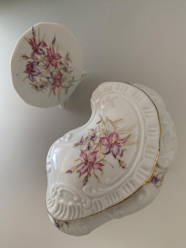 Находка для ценителей фарфора! Восхитительный винтажный сет из шкатулочка фри-форм и декоративной маленькой тарелочки с нежным цветочным узором с позолотой, с клеймом. Португалия. Без трещин, сколов и кракелюра. Размер шкатулочки 9х13 см, высота с крышкой 4,5 см, диаметр тарелочки 7,5 см. Находится не в Украине, доставка займет время, поэтому пишите, пожалуйста, перед заказом!