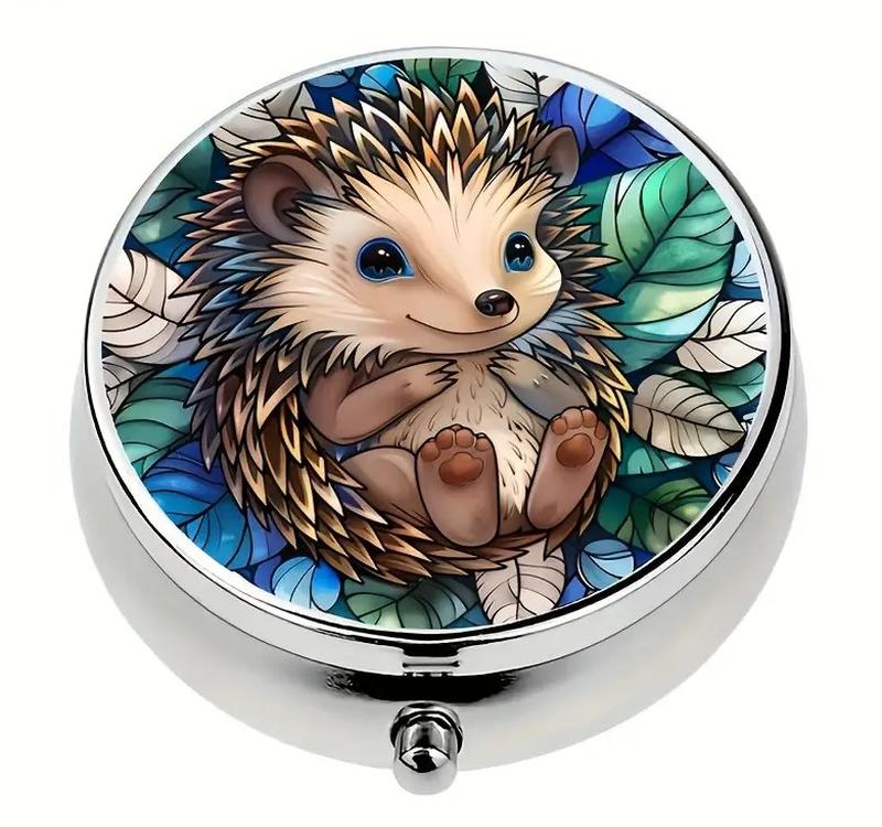 Портативный круглый футляр для мелких драгоценностей с тремя отделениями и наклейкой "Веселый ежик" отлично подходит для кармана или сумочки, в которых Вам будет удобно хранить свои таблетки, драгоценности, или другие мелкие предметы и их надёжную сохранность во время путешествий или других обстоятельств где нужно сохранить и не потерять драгоценные Вами мелкие вещи. Декоративный 3-х секционный металлический органайзер может стать уникальным замечательным подарком для Ваших друзей,та близких. Описание. Вид: органайзер, футляр, коробка, шкатулка, скриня Материал: метал, пластик. Назначение: для мелких драгоценностей, для других мелких вещей. Размеры: длина: 5см. высота: 1.8см. ширина 5см.