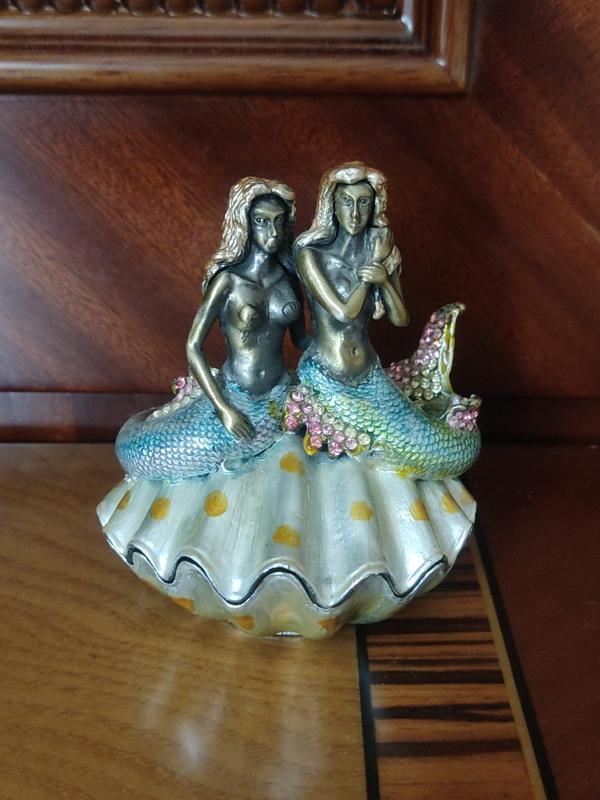 Подвійна скринька «Русалки на раковині молюска» з емалевим покриттям, стразами та відкидною кришкою Висота 9 см, ширина 8 см. Важка.