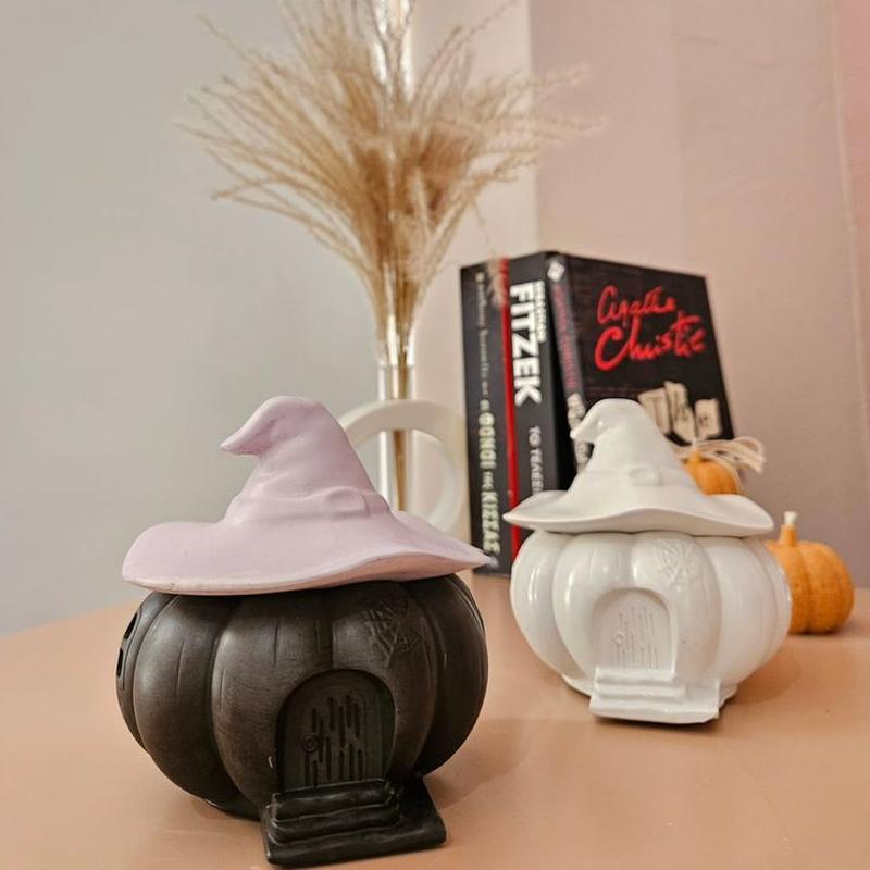 Шкатулка тыква в шляпе украсит ваш интерьер. Материал высокопрочный гипс Размеры : длинна с крышкой 10 см, ширина 9.5 см Цвет: черный с розовым , белый